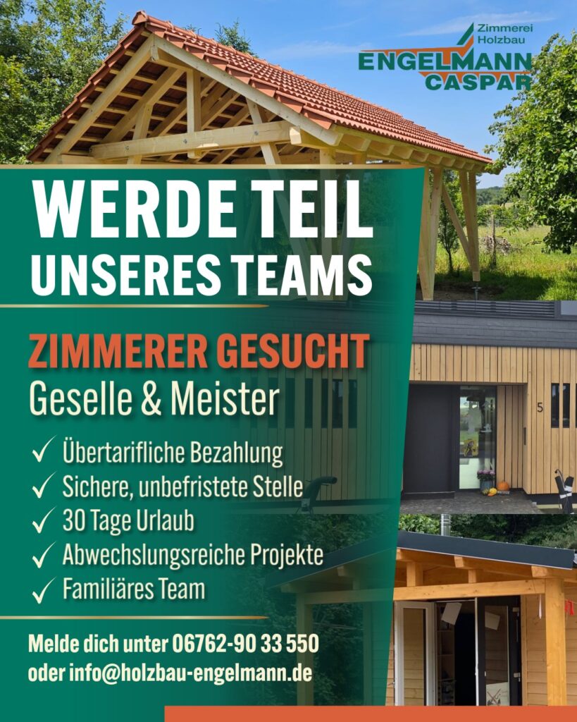 Möchten Sie Teil eines dynamischen und erfolgreichen Teams werden? Bei Zimmerei und Holzbau Engelmann bieten wir Ihnen die Möglichkeit, in einem innovativen Handwerksunternehmen zu arbeiten, das sowohl Tradition als auch moderne Technologien vereint. Wir suchen motivierte und engagierte Mitarbeiter, die unser Team verstärken und gemeinsam mit uns an spannenden Projekten im Holzbau arbeiten.
